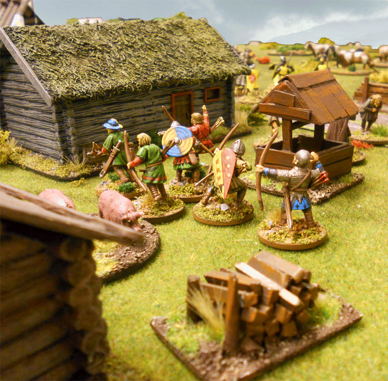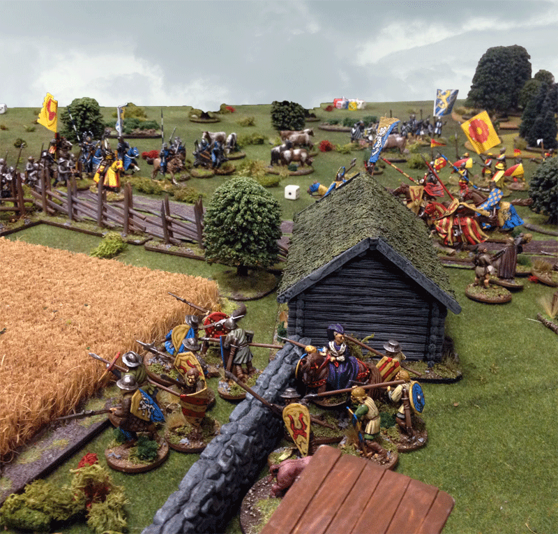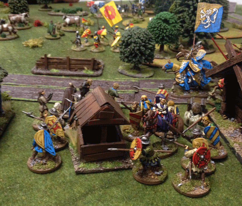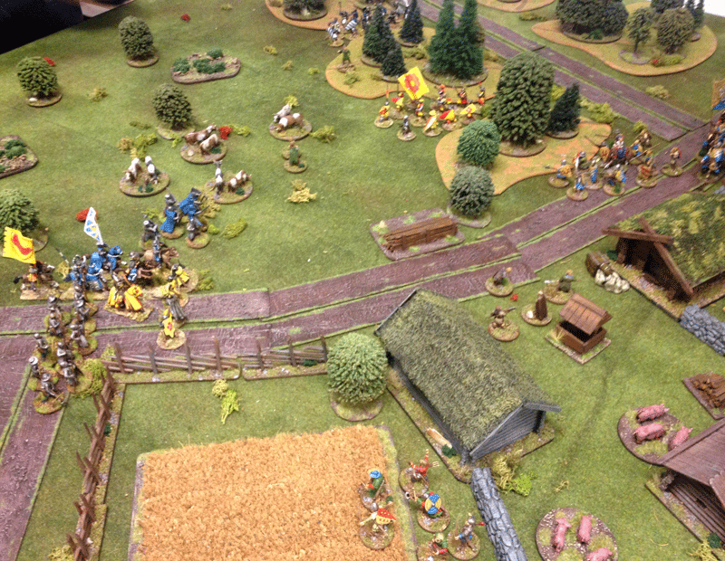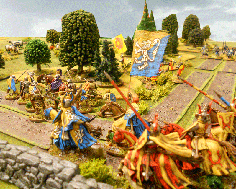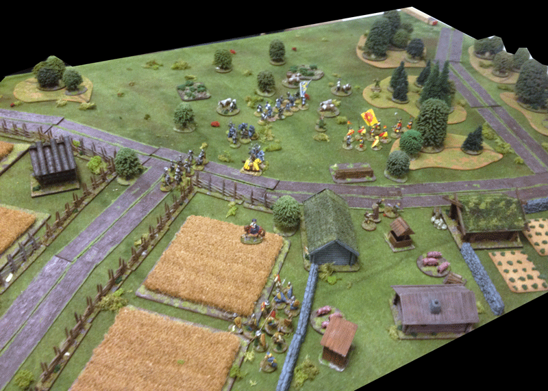 The newly back from a Baltic Crusade the Hero Matts Ketillmundsson from the House of Tre Rosor was eager to get in combat with the bride Robbers, teaching them a lesson advancing swift with his Foot Men-at-Arms...